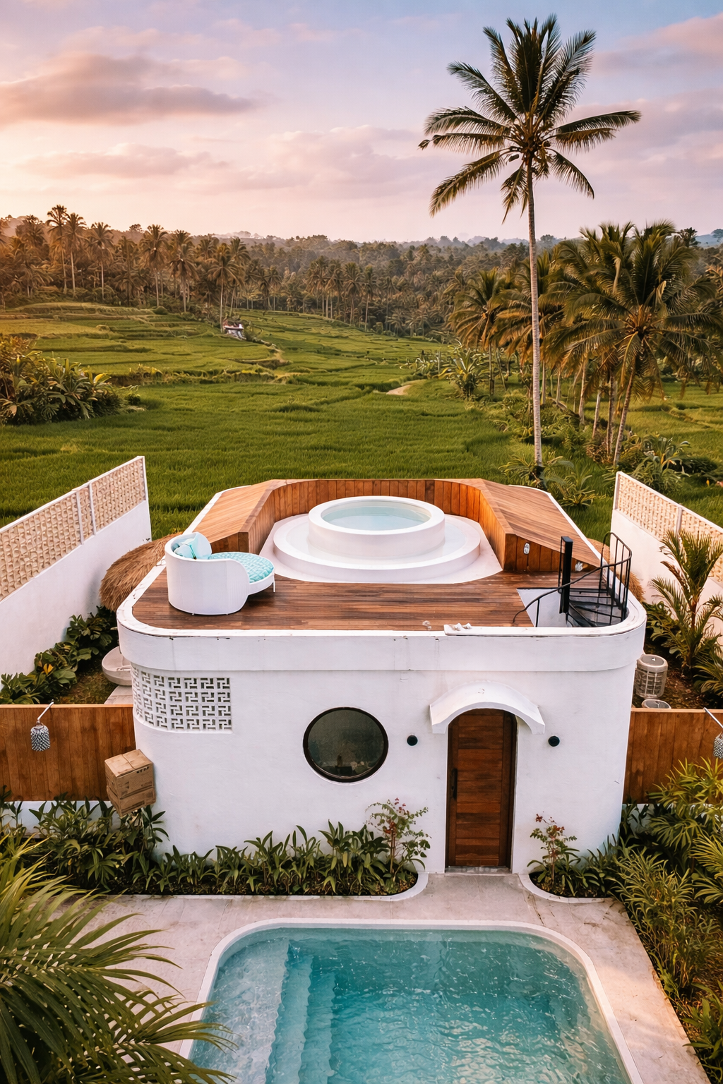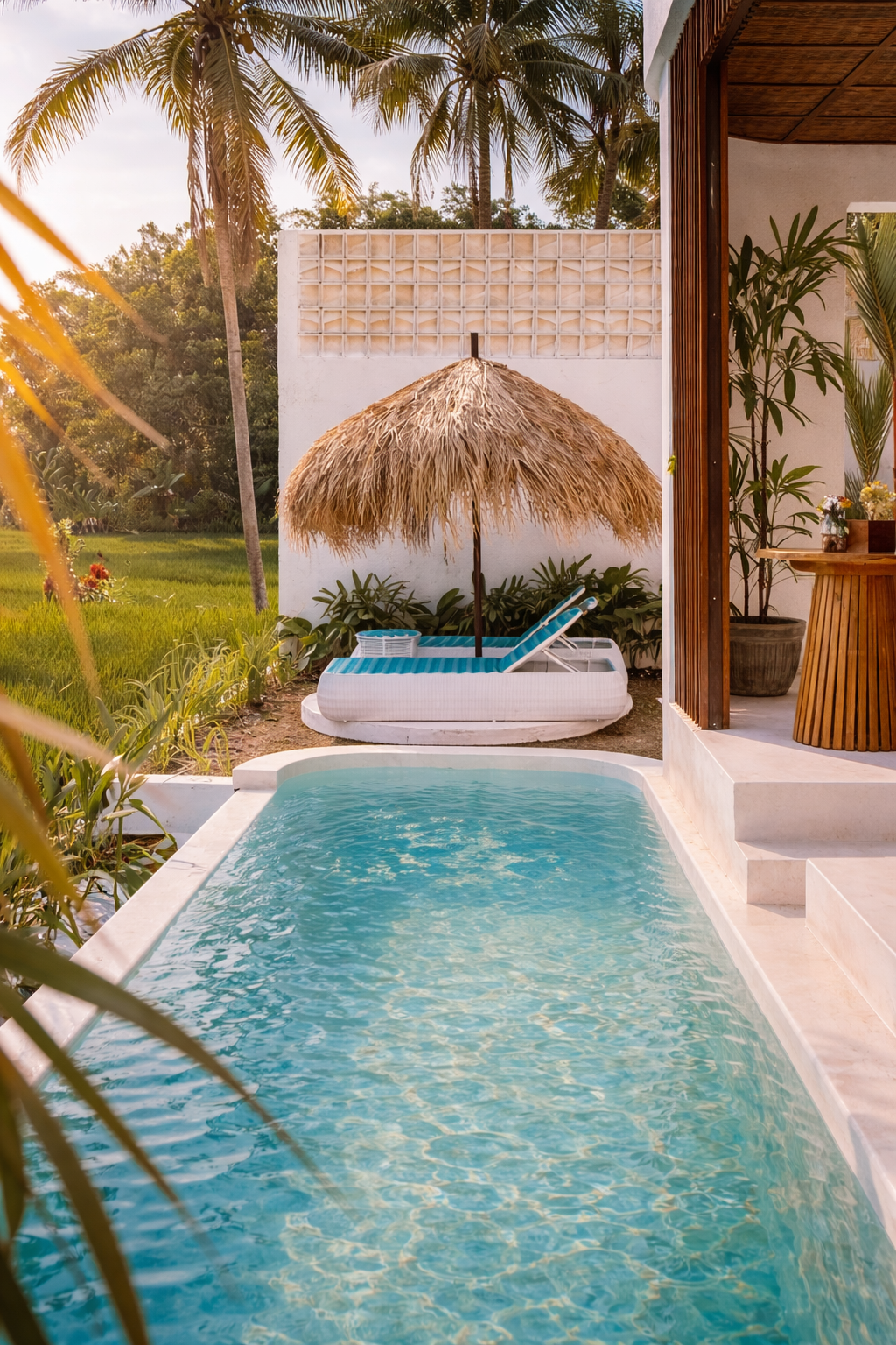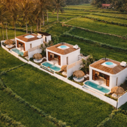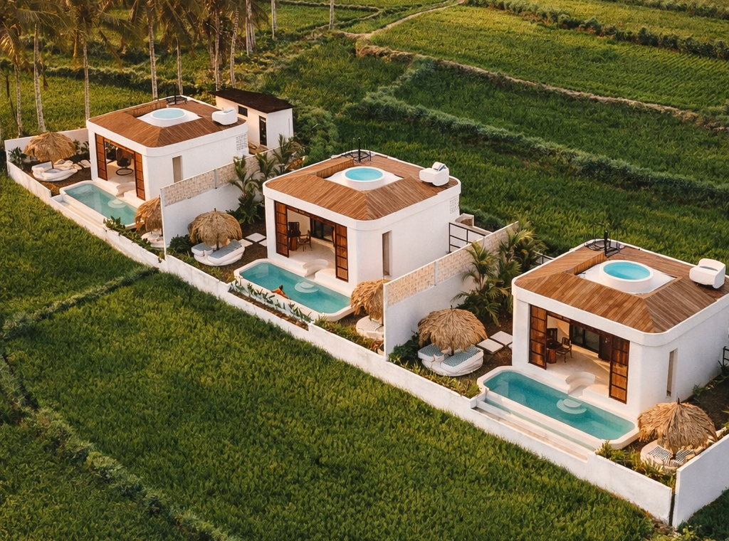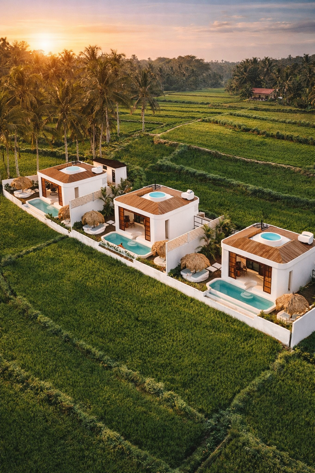 Ascunse între câmpuri infinite de orez și palmieri tropicali, aceste vile private îți oferă exact combinația pe care o cauți: intimitate, design modern și liniște totală. Diminețile încep cu lumină caldă care intră prin ferestrele mari, iar serile se transformă în momente magice, cu apusuri aurii și aer tropical.
