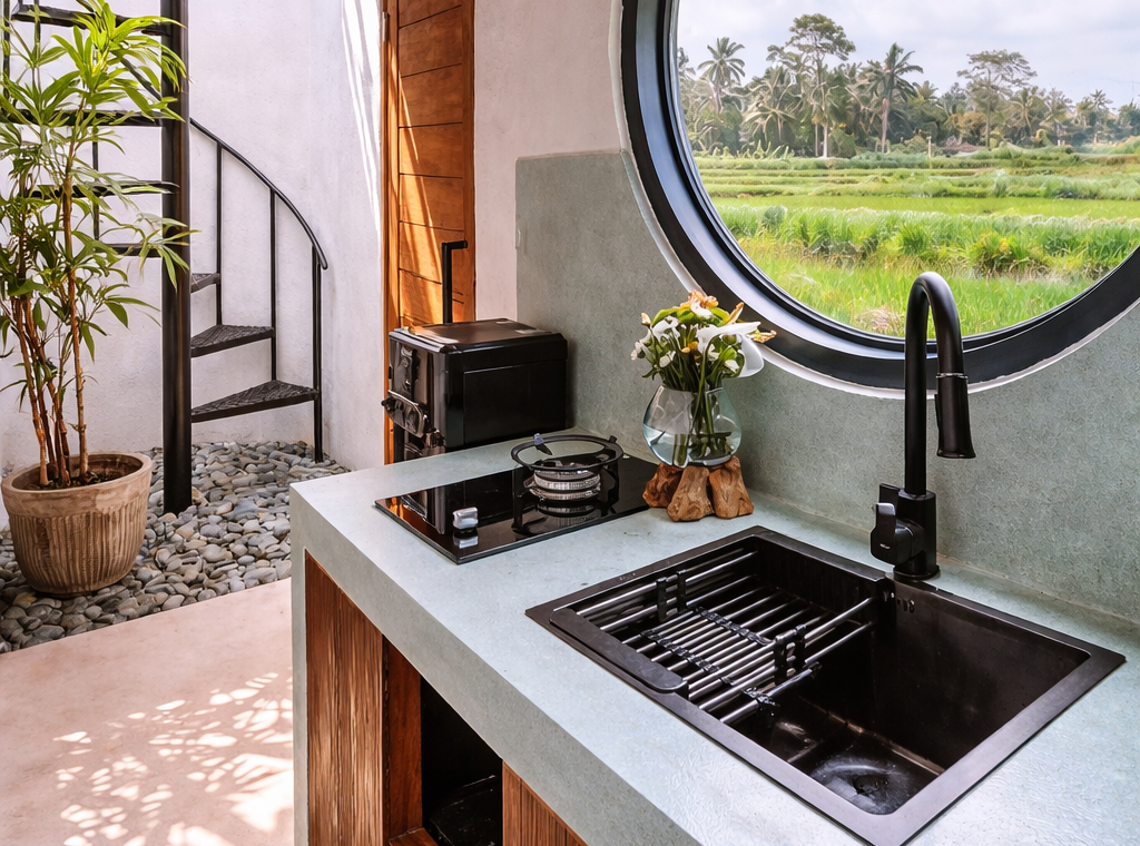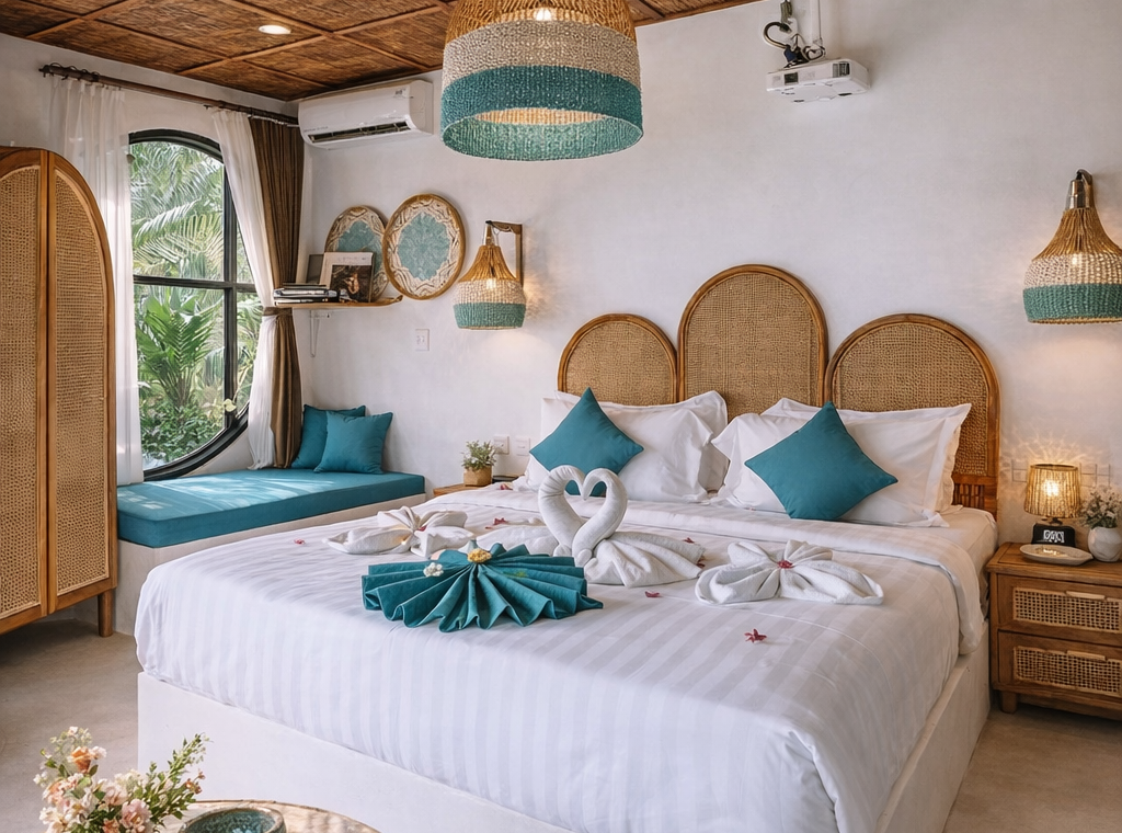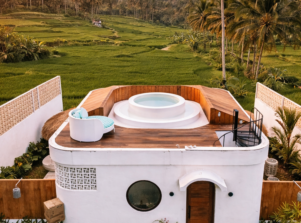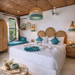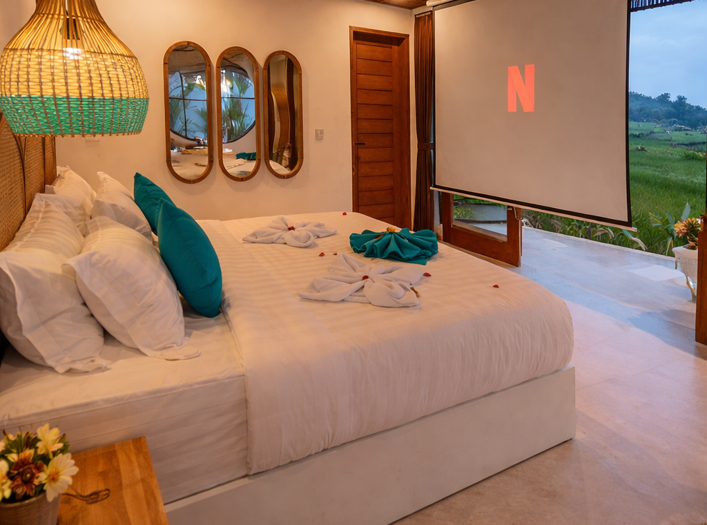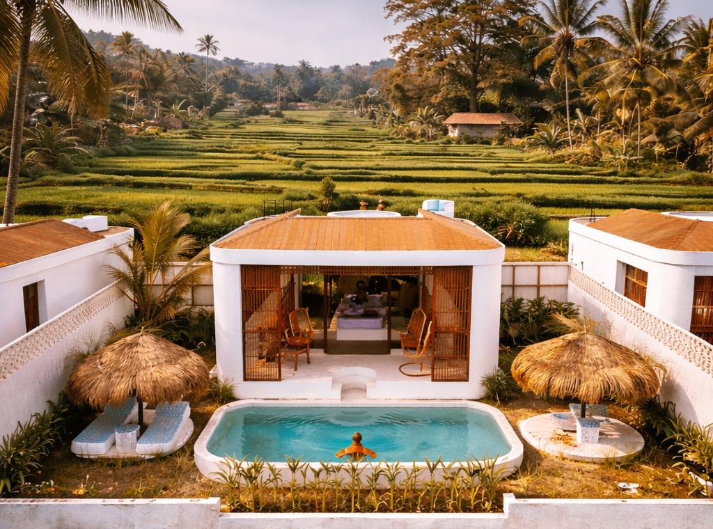 Ascunse între câmpuri infinite de orez și palmieri tropicali, aceste vile private îți oferă exact combinația pe care o cauți: intimitate, design modern și liniște totală. Diminețile încep cu lumină caldă care intră prin ferestrele mari, iar serile se transformă în momente magice, cu apusuri aurii și aer tropical.