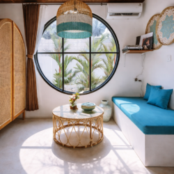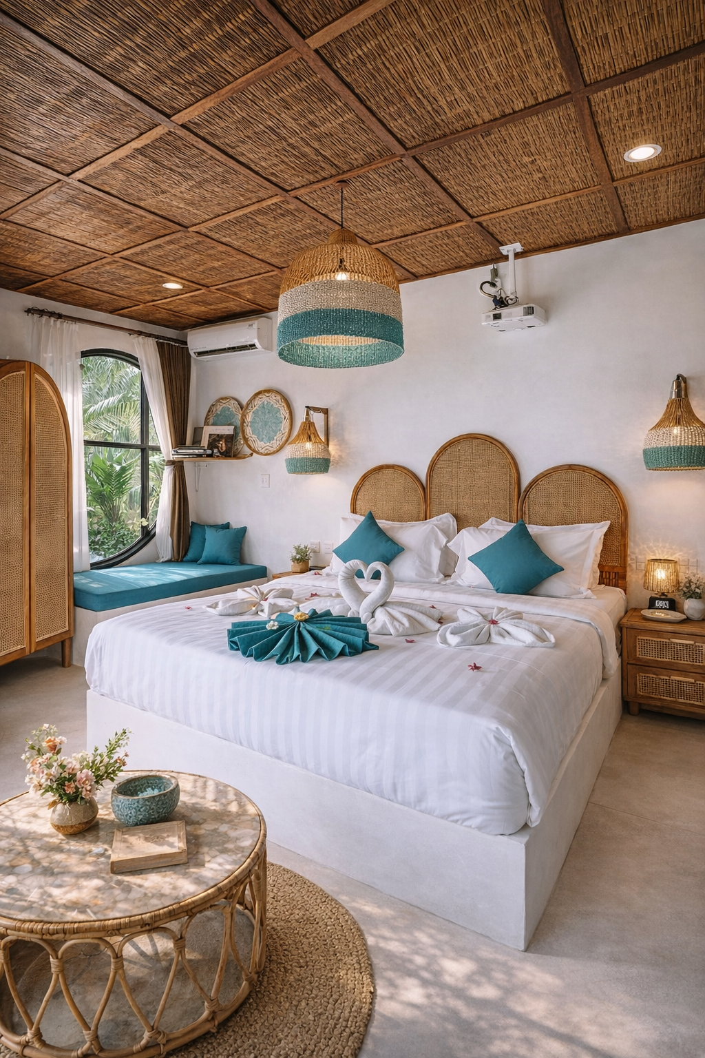 - 🛏️ Design minimalist tropical, luminos și aerisit
