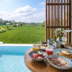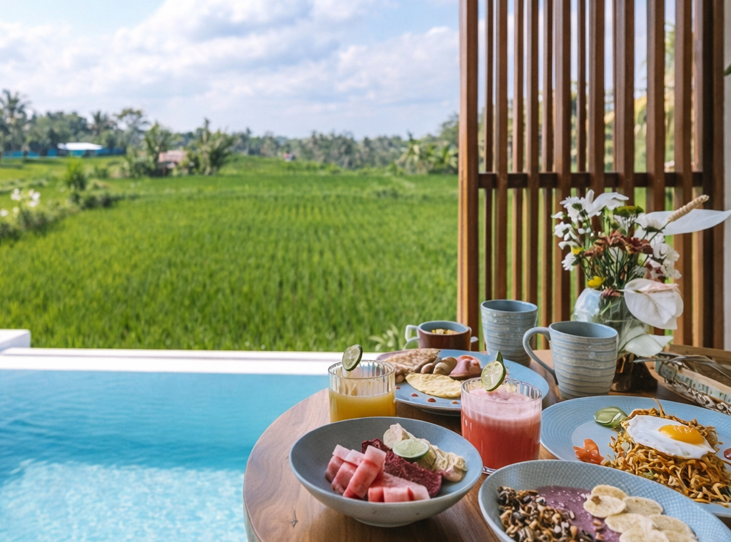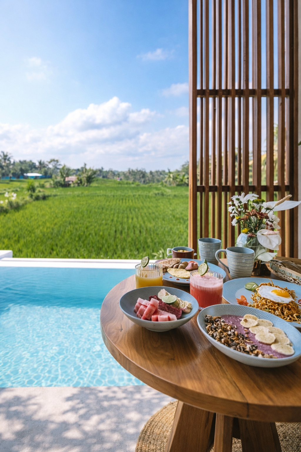 Cafeaua băută pe terasă cu vedere la orez, piscina privată doar pentru tine și senzația că timpul chiar stă pe loc.
